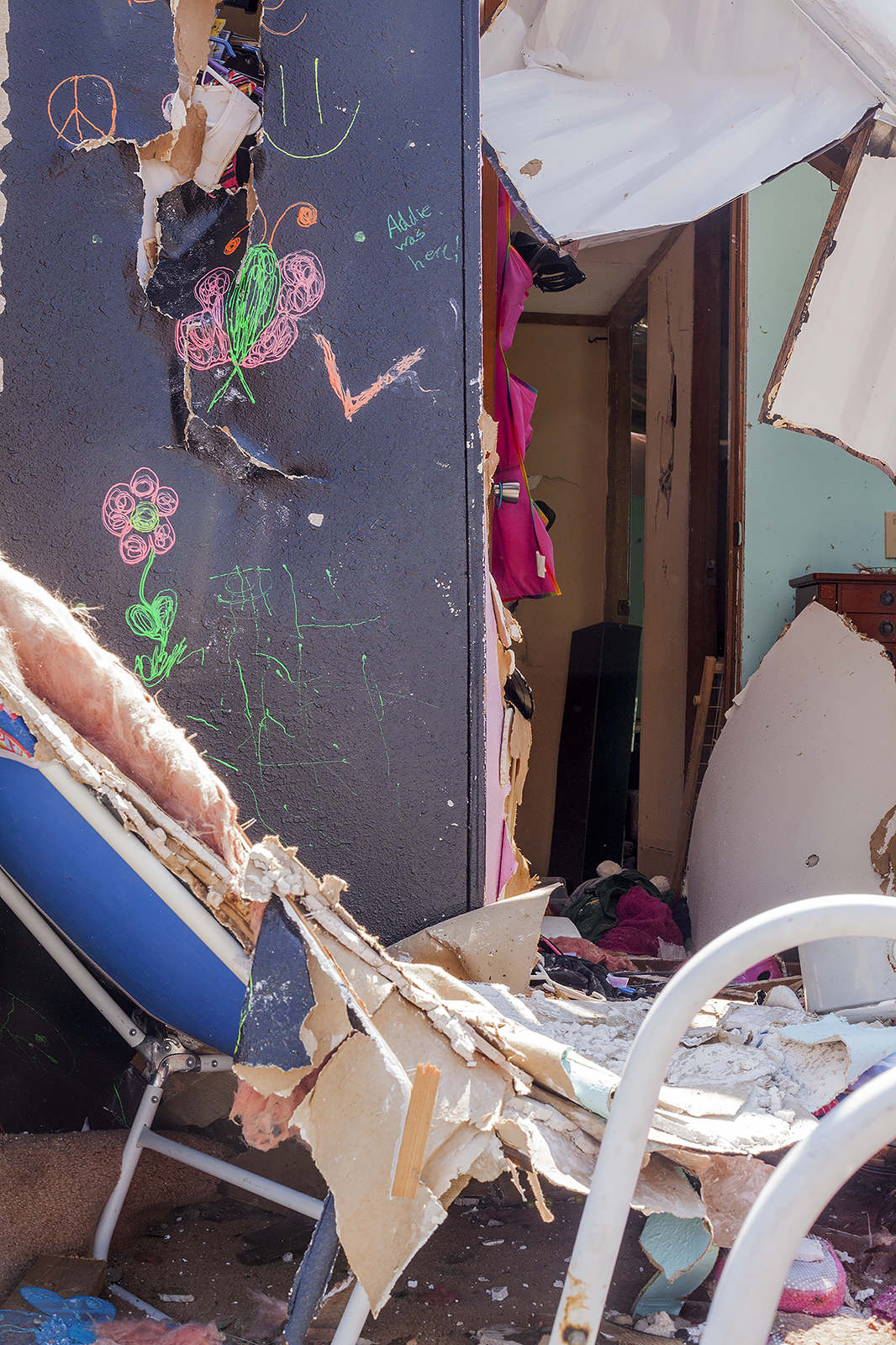 name was in big letters on the wall), including all his toys. It looked like a scene from a movie; half empty pop cans, dinner left on the stove and pictures hanging on the walls. We were able to move their photos to the back bedroom which didn’t have any rain damage, but we had to haul all the insulation out in a wheel barrow and their furniture as well. A teenager wasn’t really thinking and she opened the refrigerator! Oh my. It was horrid. Thankfully, a couple of guys showed up with a dolly at just the right moment and removed it for us. Whew!