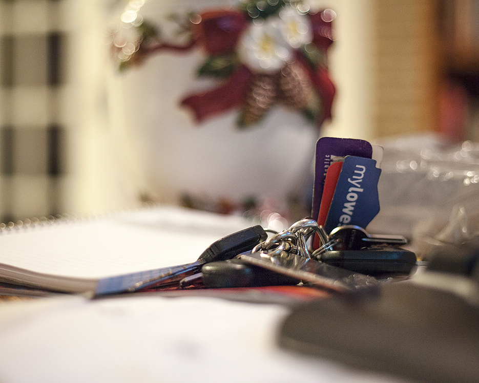It’s my desk; full of papers, my car keys and the gorgeous Christmas vintage cookie jar my sweet neighbor, Mrs. Perez, gave me, in the background. The notebook is just sitting there, waiting for me to write down my thoughts. But the focus is on my keys because they stand out. I don’t even go out often but there they were, right in the middle of everything, so I grabbed my camera and snapped away.